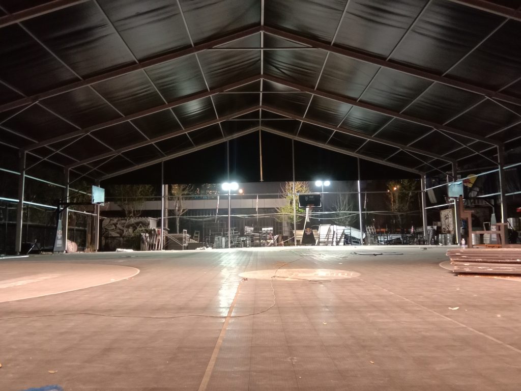 耗時短—— 以往,要建設一座新體育館,往往要經過兩三年以上的施工。但奧騰篷房借助于強大的生產和安裝能力,1萬平米以內的篷房場館,現場施工僅需幾天時間,一周內就可從容建起一座篷房體育館。