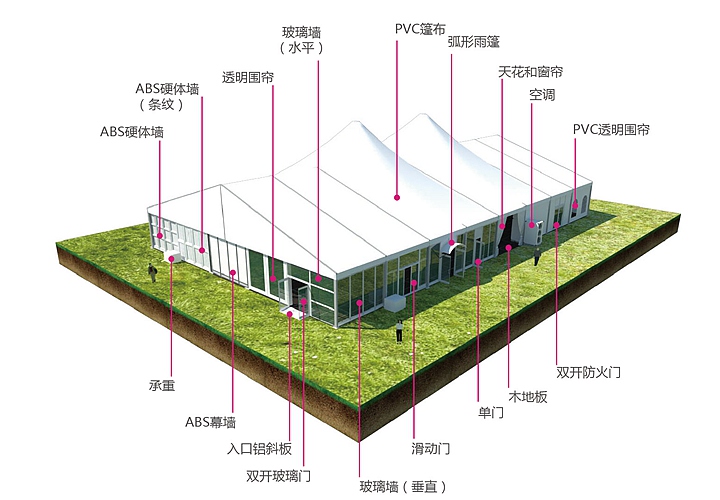 組合篷房的特點:搭建工期短,易于組裝和拆卸。適用于高端華麗的戶外活動 ,醒目的組合外形,美觀又獨特。靈活的框架可與多邊形組合,設計100%室內空間可用,設計先進,安全穩固,抗風速達100公里/小時(風載荷0.5千牛/平方米),拆裝快捷、方便,儲運體積小。加上篷布張緊系統。可以輕松應對風沙雨雪各種天氣,廣泛應用于戶外大型私人Party,婚慶聚會、產品促銷、體育賽事、戶外婚禮、節日慶典活動提供很好的戶外空間解決方案。組合篷房跨度有6m-15m,15-40m等,如果您有其它規格的需求,我們也可以為您量身訂制。