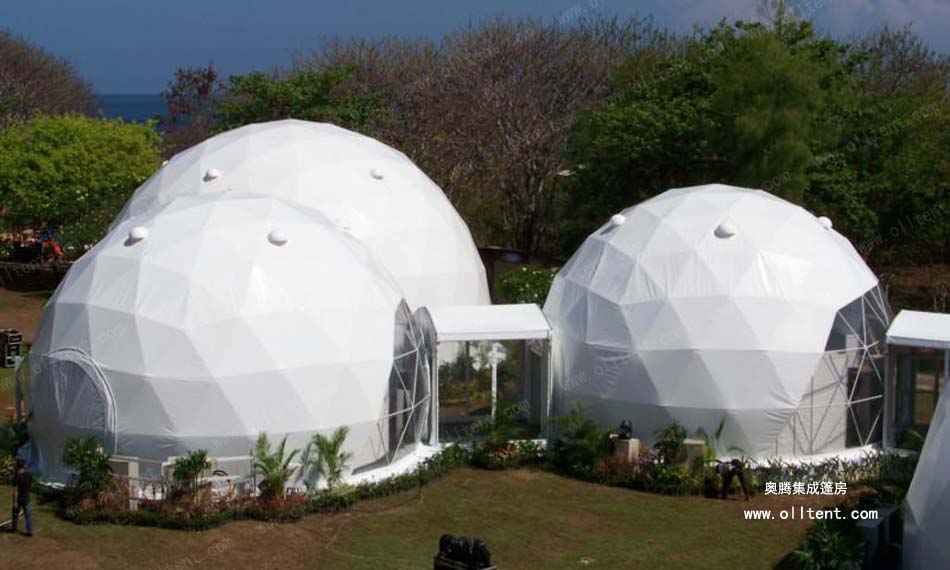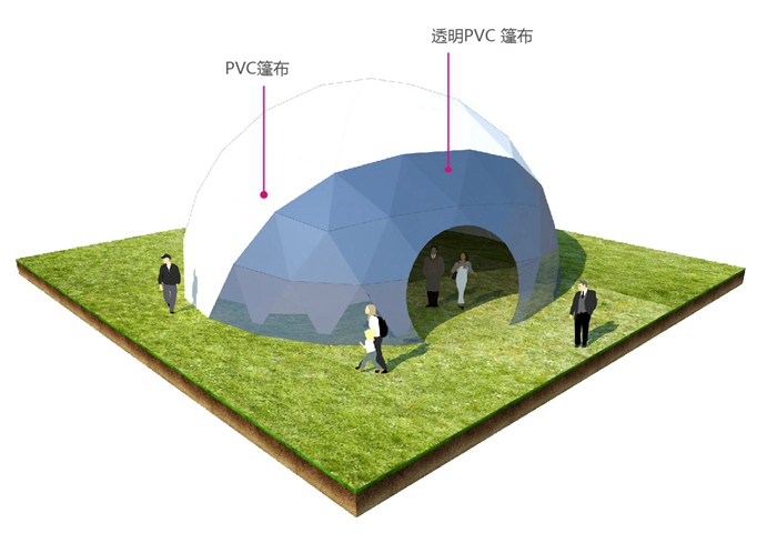 球形篷房由特制高強(qiáng)度鋼管,表面鍍鋅或噴漆,篷頂為PVC篷布,可配套玻璃門,尺寸直徑為8m,10m,15m,20m,25m,30m。