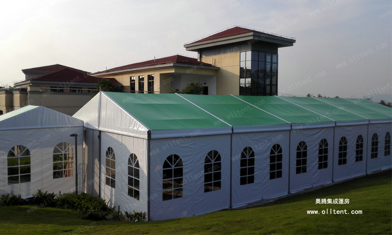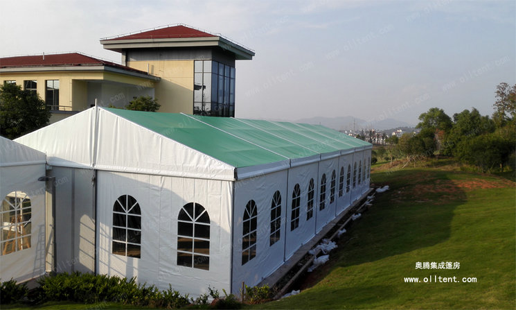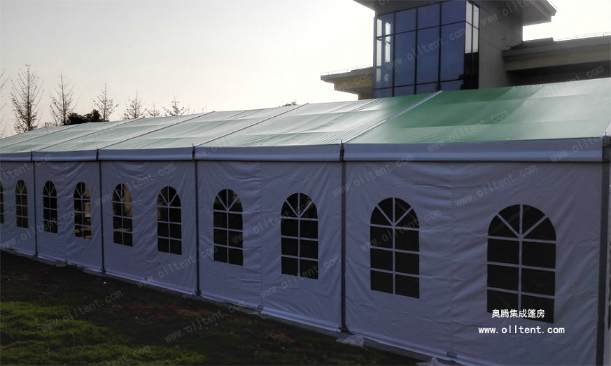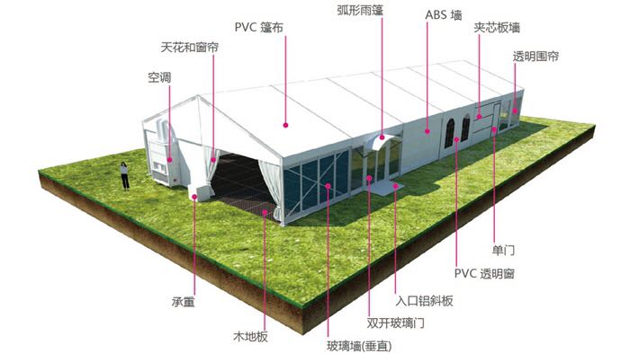 JX系列小型篷房常規寬度是6米、9米、12米、15米共四種常用尺寸。篷檐高度(邊高)是3米。篷房的結構采用單元組合式設計,長度可按3米間距增加或減少。支架的主要構件(立柱和斜梁)用四槽的122×68×3㎜四槽的高強度氧化鋁合金管材制造,篷布采用阻燃的雙面PVC刀刮布,符合歐洲DIN4102B1、M2標準。克重650、750、850克/平方米,有遮光和半透光兩種篷布選擇,篷房同樣可以配套ABS墻體、三明治墻體、彩鋼瓦墻體、玻璃幕墻、排水槽等豐富的配置,滿足各種功能需要。
