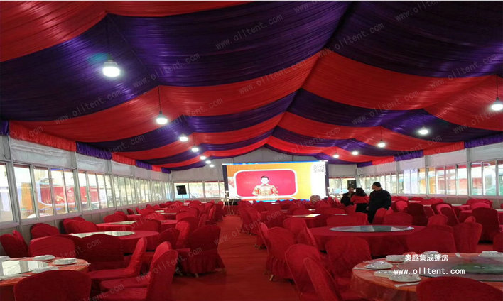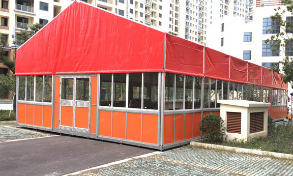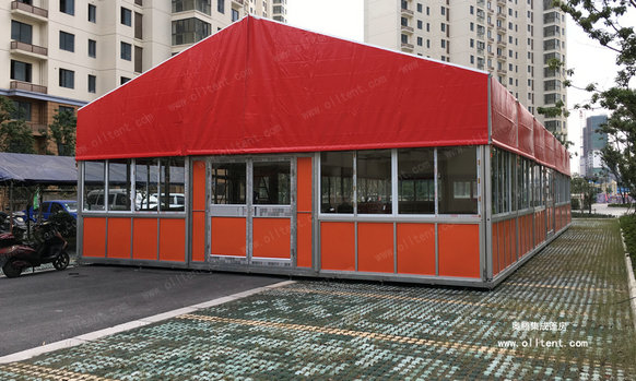CQ系列小型篷房常規寬度是6米、9米、12米、15米共四種常用尺寸。篷檐高度(邊高)是3米。篷房的結構采用單元組合式設計,長度可按3米間距增加或減少。支架的主要構件(立柱和斜梁)用四槽的122×68×3㎜四槽的高強度氧化鋁合金管材制造,篷布采用阻燃的雙面PVC刀刮布,符合歐洲DIN4102B1、M2標準。克重650、750、850克/平方米,有遮光和半透光兩種篷布選擇,篷房同樣可以配套ABS墻體、三明治墻體、彩鋼瓦墻體、玻璃幕墻、排水槽等豐富的配置,滿足各種功能需要。